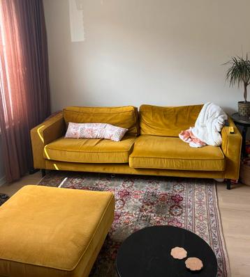 Comfortabele gele stoffen/suedelook bank. Geschikt voor twee personen of meer. In prima staat. Ideaal voor een gezellige woonkamer. De bank is 230 cm breed en 95 cm diep.