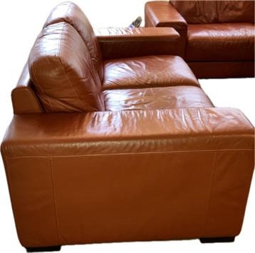 Te koop: een prachtig vintage lederen bankstel bestaande uit een 2-zitsbank en een 3-zitsbank, plus een donkergroene lederen stoel met kruk. Deze set straalt karakter en kwaliteit uit en is perfect vo