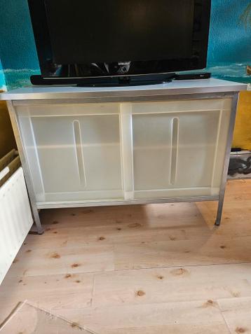 Praktisch en stijlvol wit houten meubel met een metalen frame. Het meubel is voorzien van twee schuifdeuren. De schuifdeuren zijn van een lichtdoorlatend kunststof, wat een moderne uitstraling geeft.