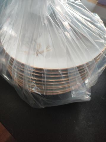 Witte borden met een gouden rand. De borden zijn rond en hebben een simpel design. Gratis ophalen