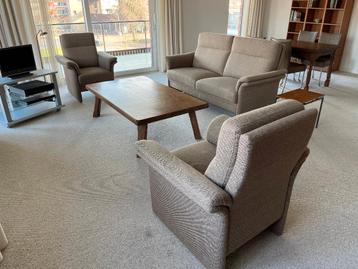 Driedelig bankstel de bank is 2 m lang, 102 cm hoog en 85 cm diep. Twee fauteuils van 102 cm hoog, 85 cm breed en 80 cm lang. Een nog zeer net bankstel met stoffen warme bekleding wat ook goed zit. Du