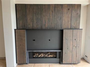 Mooie omkasting voor een sfeerhaard, gashaard of tv. Het is gemaakt van hout en heeft een donkere afwerking. Er zijn ook twee kasten aan de zijkanten en een bovenkast. De haard is niet inbegrepen. Kas