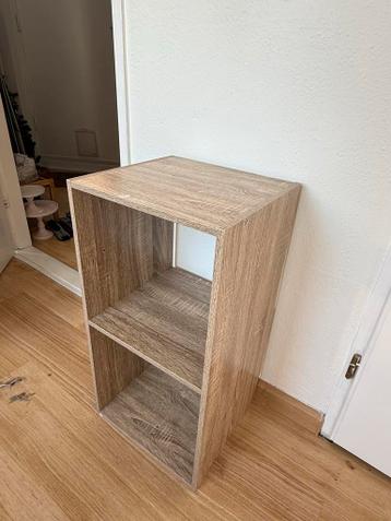 Een klein kastje met twee vakken, gemaakt van lichtbruin hout. Het is een simpel, open model dat je voor verschillende dingen kunt gebruiken. Het kastje is gratis op te halen.