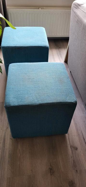 Set van twee gebruikte azuurblauwe poefjes. Ze zijn nog functioneel, maar kunnen een goede schoonmaakbeurt gebruiken, een mild sopje doet wonderen (in zijn geheel om waterkringen te voorkomen!) . Idea