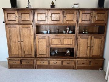 Huiskamerkast, afmetingen; 317 cm lang, ± 203 cm hoog, is verdeeld in drie gedeelten, 91-131-91. Ondergedeelte is 317 cm lang, 40 cm hoog en diep 60 cm. Daarop de drie gedeelte 91 cm-135 cm en 91 cm,