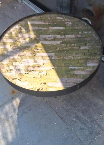 Onderstel en blad zijn nog goed. Blad en rand even schuren. Doorsnee 74 cm, hoogte 35 cm