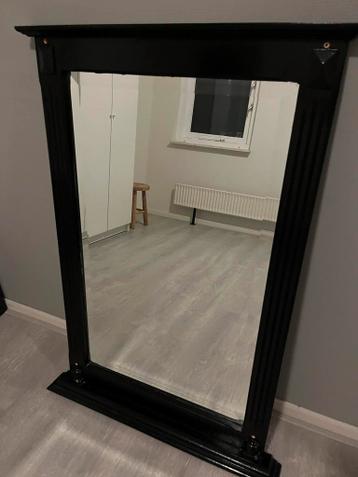 Een grote spiegel met een zwarte lijst. De lijst heeft een klassiek uiterlijk met versieringen aan de zijkanten en boven- en onderkant. De spiegel is rechthoekig van vorm.