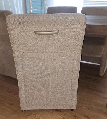 4 eetkamer stoelen. Zijn niet doorgezakt en de wielen rijden goed. De stoelen zijn gebruikt, en op bepaalde punten is de stof doorgesleten. Ook voor een handige stoffeerder een leuke set.
