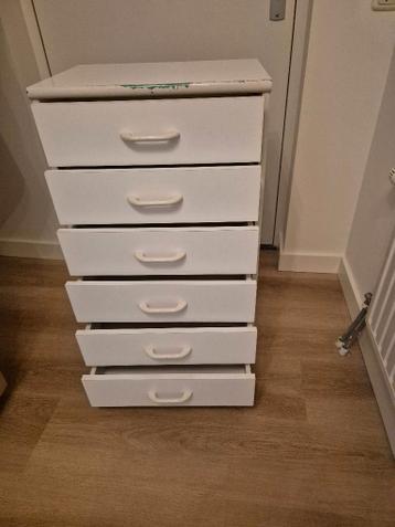 Gratis af te halen. Wit ladekastje met 6 lades. Lichte (verf) beschadiging bovenaan. Maten diepte 35 cm. Breedte 50 cm. Hoogte 85 cm.