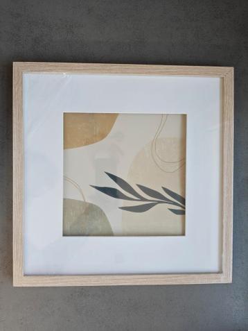 Deze fotolijst is nog nieuw en zit in de originele folie. Het is een lichte houten lijst met een passe-partout. Er zit een abstracte print in, maar die kan eruit. De afmetingen zijn 40*40 *2,5 cm.