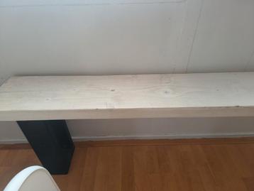Dit is een zitbank met een lichte houten zitting en zwarte stalen poten.