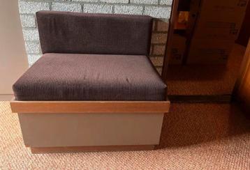 Deze set bestaat uit een bank, een stoel en twee tafeltjes. De bank en stoel zijn bekleed met bruine ribstof. De tafeltjes hebben een lichtbruin blad en donkerbruine poten met houten accenten.