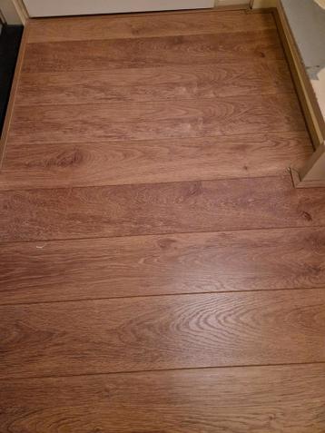 Hierbij bied ik een laminaatvloer aan. Het gaat om ongeveer 35 vierkante meter laminaat. De planken hebben een houtnerfpatroon en een bruine kleur. Het laminaat is al gedemonteerd en ligt klaar om opg