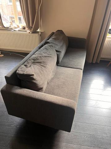 Mooie grijze tweepersoonsbank. De vulling van de kussens is deels verwijderd, maar kan worden meegeleverd om opnieuw te vullen. Er zit een kleine scheur in een van de kussenhoezen. Verder in prima sta