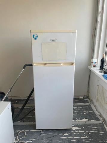 Witte edy koelkast met een vriesvak bovenaan. De koelkast heeft glazen planken en een lade onderin. De deur heeft ook vakken.