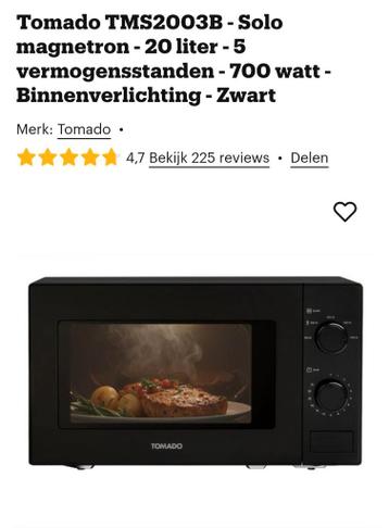 Deze tomado magnetron werkt naar behoren. Het is een zwarte magnetron met draaiknoppen. De magnetron heeft binnenverlichting en is vrijstaand.