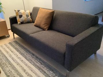 Zwart bruin gemêleerde stof met 1 slijtplek afmetingen: breedte 202 diepte 92 en hoogte 80 cm