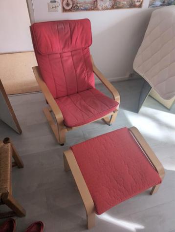 Ikea poang stoel met bijpassende voetenbank. De bekleding is rood en heeft lichte slijtageplekken. Het frame is van licht hout. De stoel en voetenbank zijn gebruikt. Gaat weg vanwege aankoop nieuwe st