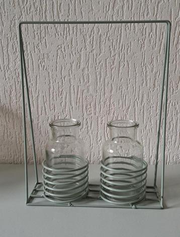 Leuke metalen houder met bloemenvaasjes.