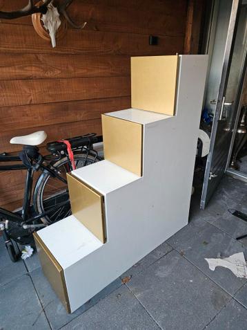 Een trapkast met vier treden. De voorkant van de treden zijn goudkleurig. De rest van de kast is wit. De kast is gratis op te halen.