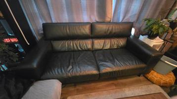 Zwarte leren bank met verstelbare hoofdsteun. De bank is 210 cm breed en 93 cm diep.