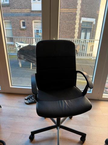 Een zwarte bureaustoel met een stoffen rugleuning en zitting. De stoel heeft armleuningen en een onderstel met wieltjes. De zitting is deels van kunstleer.
