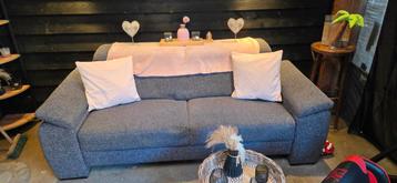 Een grijze tweepersoonsbank met stoffen bekleding. De bank heeft twee zitkussens en twee rugkussens.