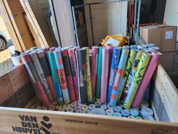 Een grote partij behangrollen. Er zijn veel verschillende kleuren en patronen. De rollen zijn van verschillende formaten, sommige zijn groter dan andere. Het is een mix van diverse soorten behang.