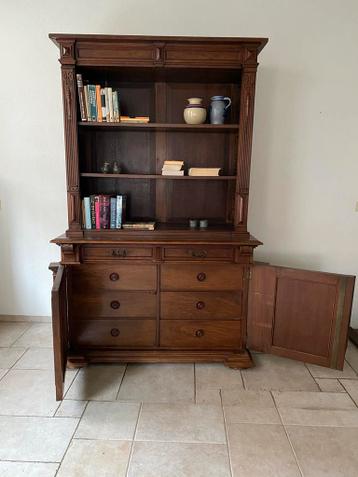 Prachtige antieke boekenkast met een klassieke uitstraling en veel opbergmogelijkheden. De kast beschikt over open schappen voor boeken en decoratie, evenals lades en deuren aan de onderzijde voor ver