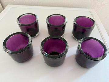 Dit is een set van zes paarse theelichthouders van glas. Ze zijn allemaal hetzelfde en hebben een donkerpaarse kleur. Ze zijn geschikt voor kleine kaarsjes. Alleen ophalen!!