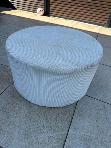 Deze poef is gemaakt van ribstof en heeft een ronde vorm met een diameter van 75cm. De kleur is licht, bijna wit. Hij is te gebruiken als extra zitplek of om je voeten op te leggen. Zelf schoonmaken m