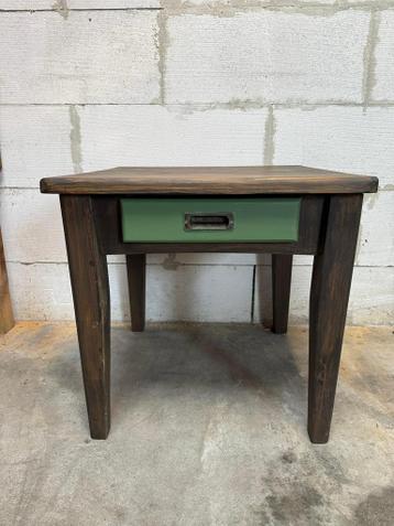 Deze charmante bijzettafeltjes zijn gemaakt van donker gebeitst hout en hebben een rustieke uitstraling. De tafeltjes zijn voorzien van een handige lade in een opvallende groene kleur, perfect voor he