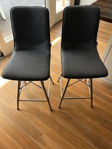 Set van 2 barkrukken, de zitting kan draaien. De biezen zijn gerafeld. Zithoogte 65cm.