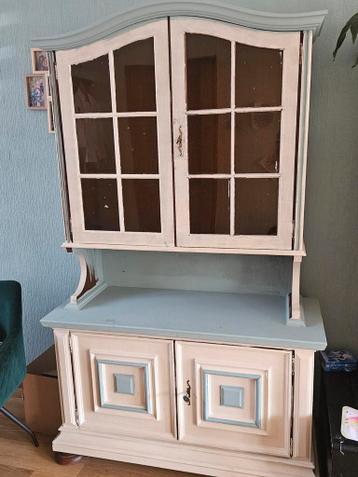 Mooie vitrinekast van goede kwaliteit, een project dat helaas niet is afgemaakt. De kast is 116 cm breed en 184 cm hoog (gemeten vanaf het hoogste punt). Het merk is onbekend. Ideaal voor iemand die h