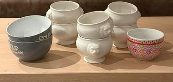 Leuke set van 6 diverse soepkommen. Ideaal voor een gezellige soeplunch of diner. De set bestaat uit twee grijze kommen met 'soup of the day' opdruk, drie witte kommen met een leeuwenkop relië