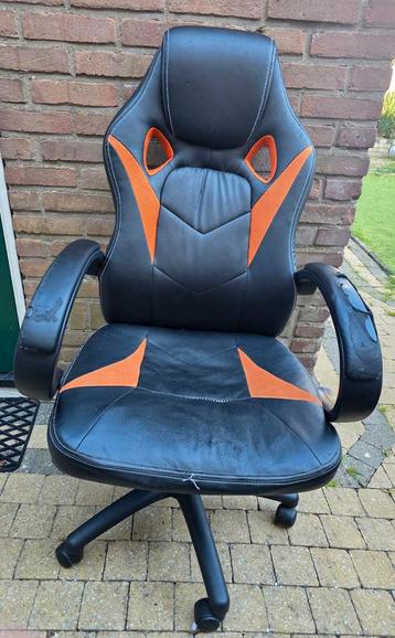Comfortabele gaming bureaustoel in zwart met oranje accenten. Ideaal voor lange gamesessies of werkdagen. De stoel is gebruikt en heeft zichtbare slijtage, met name aan de armleuningen en zitting, zoa