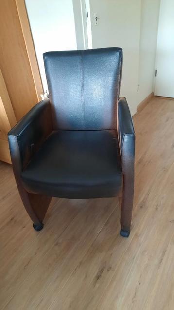 4 bruine eetkamerstoelen, op zwenkwielen, rugleuning verstelbaar, breedte ca 60cm hoogte armleuning ca 67cm.