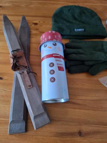 Decoratie winter: sneeuwpop-bus, ski's, muts & handschoenen. Muts & handschoenen zijn nieuw en dus niet gedragen.
