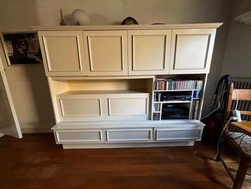 Grote en stevige servieskast of wandmeubel, ideaal voor het opbergen van servies, boeken of andere spullen. De kast is 227 cm breed, 56 cm diep en 173 cm hoog. De kast is gebruikt en heeft lichte gebr