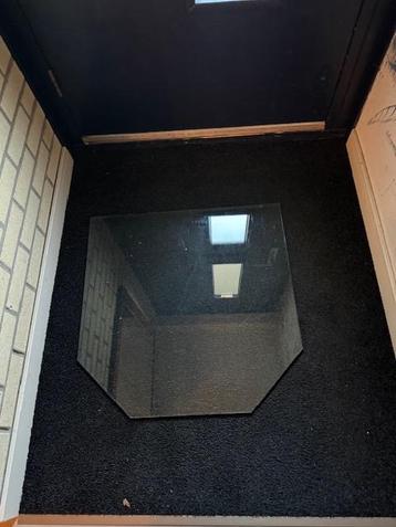Een glazen plaat om voor de kachel of de haard te leggen hij is 70 cm met afgeschuinde hoeken. Er is een kleine splinter af bij de achterkant