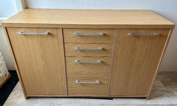 Lage kast met 2 grote en 2 kleinere lades en 2 deurtjes waarachter een legplank. De kast is van gefineerd hout. Breedte 128,5cm, diepte 52cm en hoogte 82,5cm kast ziet er nog goed uit moet van de 1e v