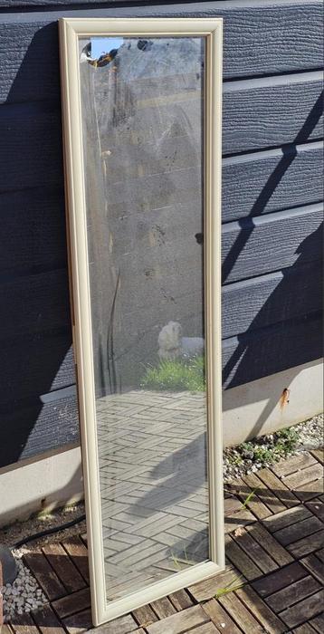 Ik geef deze spiegel gratis weg. De spiegel is 35 cm breed en 125 cm lang. Er zit een lichte lijst omheen. De spiegel heeft wat gebruikssporen.