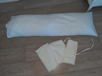 Een lang wit kussen met een geruit patroon. Er zitten ook 3 extra hoezen bij, deze zijn effen gebroken wit. Het kussen is langwerpig van vorm.