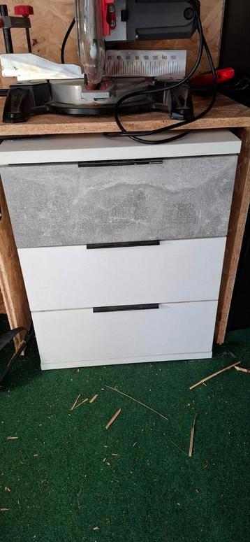 Een ladekast met drie laden. De bovenste lade heeft een grijs patroon en de twee onderste laden zijn wit. De handgrepen zijn zwart.
