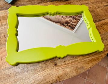 Deze groene spiegel heeft een speelse vorm. De spiegel is rechthoekig met afgeronde hoeken en decoratieve randen. De achterkant is ook groen en heeft bevestigingspunten om hem op te hangen. Afmetingen