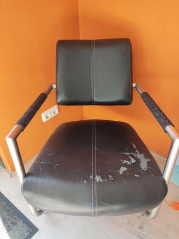Deze zwarte stoel is gratis af te halen. De bekleding laat los, vooral op de zitting. Misschien handig voor iemand die de stoel opnieuw kan bekleden.