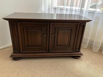 Mooie donkerbruine houten kast met twee deuren en een legplank. Ideaal voor het opbergen van spullen in de woonkamer, slaapkamer of hal. De kast is in goede staat en heeft een klassieke uitstraling. A