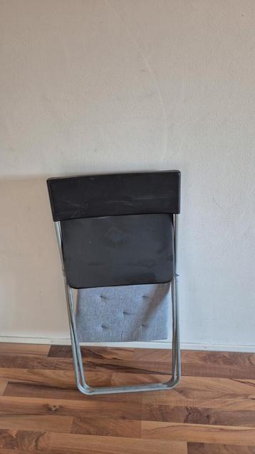 Een klapstoel met een zwart zitvlak en rugleuning. Het frame is van metaal. De stoel is opvouwbaar en makkelijk op te bergen.
