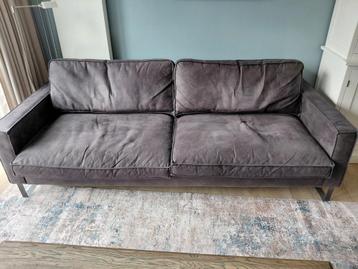 Comfortabele 3-zits bank in antracietgrijs leer. Deze bank biedt voldoende ruimte voor drie personen. Let op: er is een kleine beschadiging aan het leer op het zitvlak. Wij hebben er een fleecedeken o