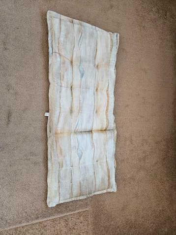 Een set van vier stoelkussens voor tuindtoelen. Ze zijn in goede staat en hebben een licht patroon. De kussens zijn voorzien van knopen en lussen om ze vast te maken.